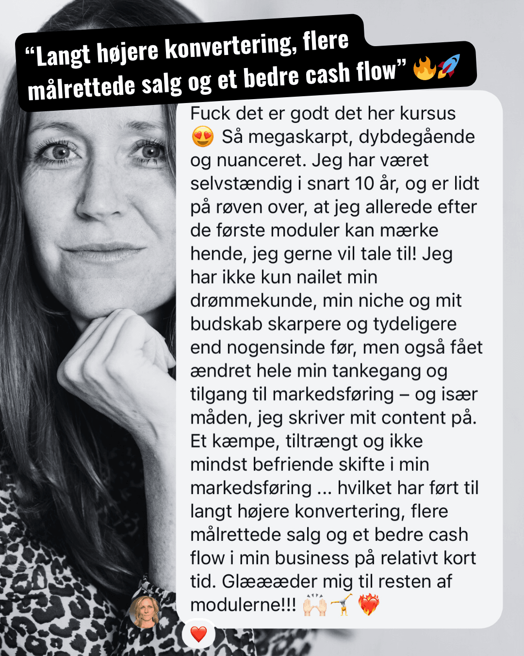⛔️ Har lært at skrive autentisk – men ikke hvordan du sælger med dit content. Du ved allerede, at du skal møde op og være synlig derude med din markedsføring. Ærligt, ægte og kærligt. Men ingen har lært dig, hvordan du skriver på en måde, der giver betalende kunder i hjertebiksen.