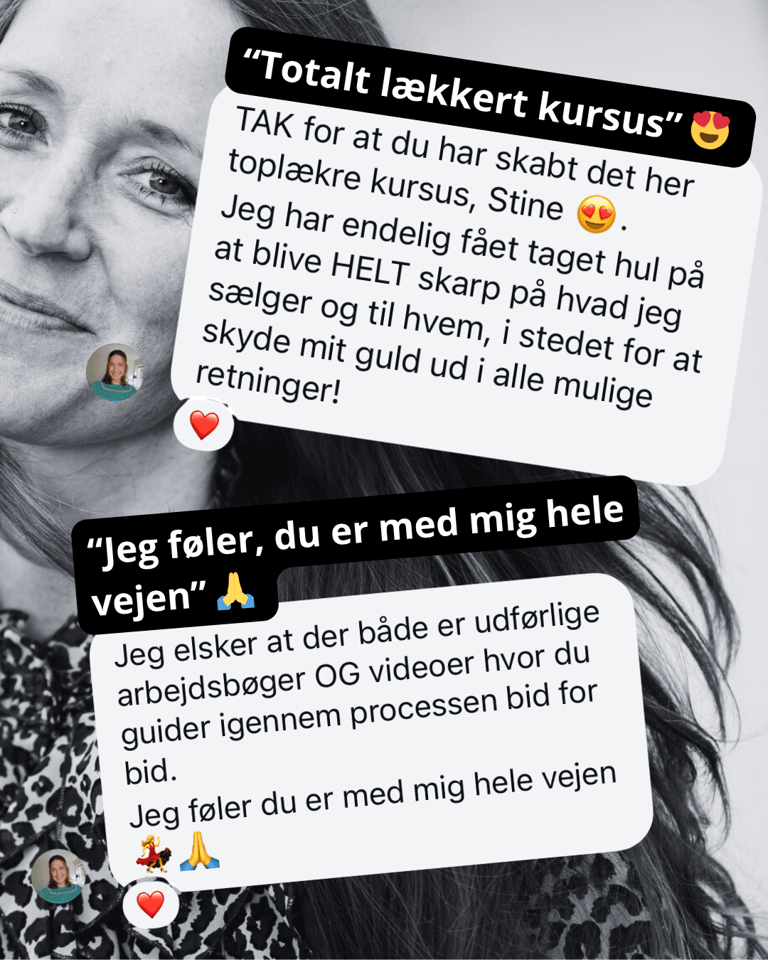 ✔ Flettemetoden til 100K™. Lær, hvordan du sælger på en naturlig måde i hver eneste post og mail – uden at virke pushy eller lyde som Sælge-Helge. Det her er metoden, jeg bruger hver eneste dag til at lede mine drømmekunder fra mine opslag og helt ind i min verden. Ingen frygt. Ingen FOMO. Bare content, der åbner hjertet og lukker salget.